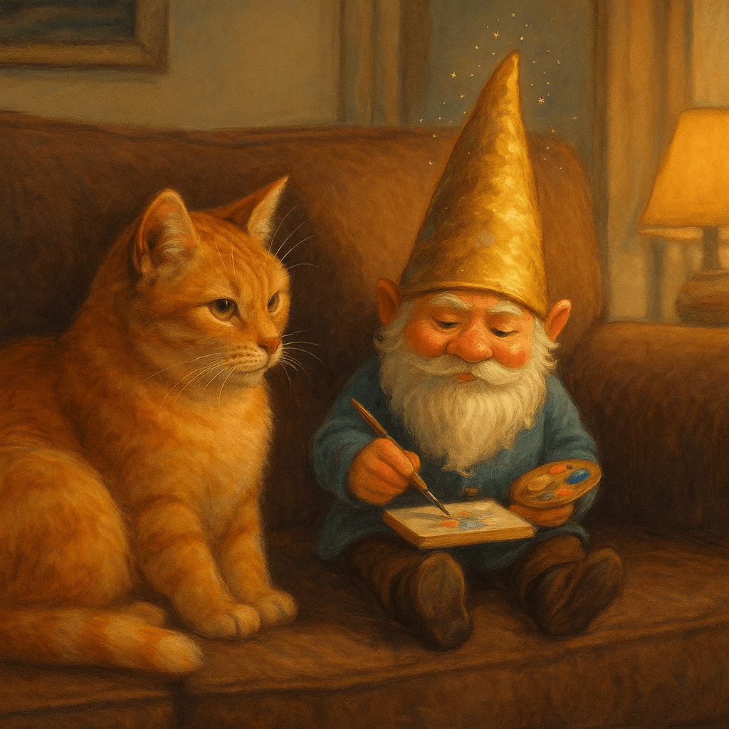 The gnome. The cat. The odd, cozy absurdity of it all. Somewhere between the smell of acrylic markers and the sound of soft purring, a story started to form. Not a grand, save-the-world epic — just a gentle tale about small beings with big personalities and a knack for showing up when life needs a dash of magic.